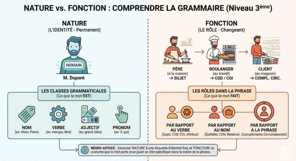 Cela aide l’apprenant à comprendre que la nature du mot ne change pas (l’acteur), mais que son rôle change selon le contexte (la fonction).