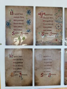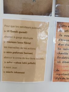 - Le Texte Latin : Choisir un court passage significatif, une devise (comme Ora et labora – Prie et travaille) , ou un extrait de chant grégorien (comme le début de l’hymne Ut queant laxis illustrée dans le document).