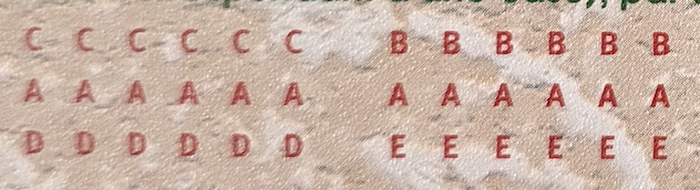• Phase II : les pions ne peuvent quitter le jeu que s’ils sont arrivés aux six dernières lignes. On ne peut sortir les pions du jeu que si un des dés sort un chiffre correspondant à une des cases des six dernières lignes. Si un pion est pris, il est mis en réserve et ne pourra être remis sur le jeu que si un des dés sort un chiffre correspondant à une case vide de son propre pion.