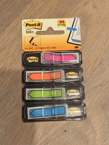 Le matériel est minimaliste : les fiches de jeu et des post-it « index » de différentes couleurs.