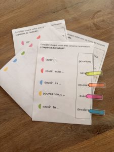 L’activité se présente sous forme de fiches plastifiées, avec une série de verbes avec leurs terminaisons à compléter d’un côté et le corrigé par code couleur correspondant de l’autre. Le but est de créer les bonnes paires !