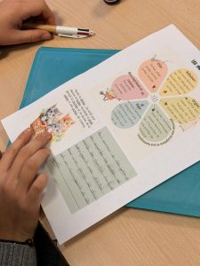 « Sur les lignes de votre fiche, inventez une petite histoire ou une phrase rigolote. Votre texte doit obligatoirement contenir au moins 4 mots se terminant par -tée présents dans la fleur. »