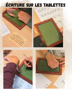 Ce sont des moments d’apprentissage inoubliables où ils ont pu vivre l’histoire. L’avantage d’une tablette de cire ? On peut effacer le texte en lissant la cire avec le bout du stylus et recommencer sans gaspiller de papier !