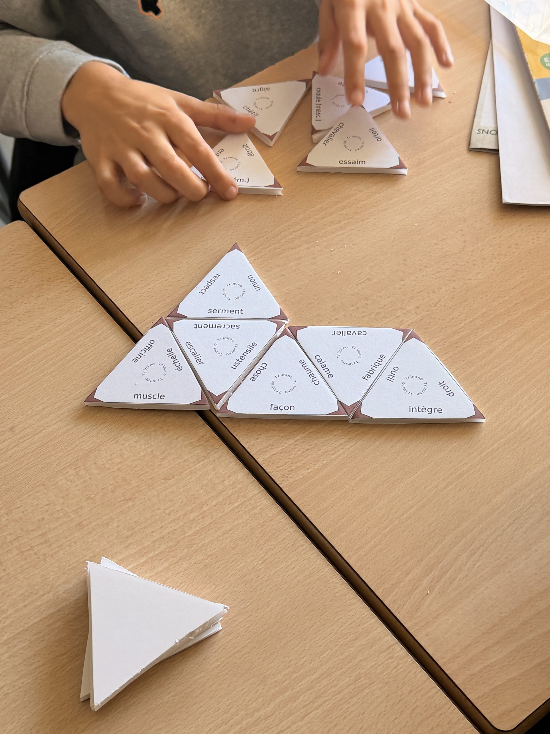- Activité collaborative : le Triomino est idéal pour le travail en petits groupes (2 à 4 élèves), favorisant l’échange et l’argumentation autour des choix lexicaux.