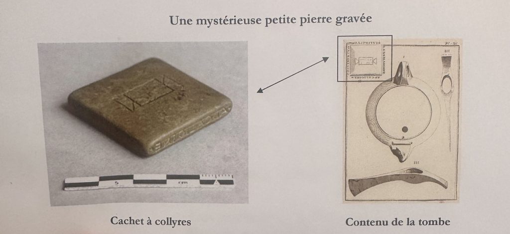 Parmi les objets archéologiques les plus étonnants liés à la médecine antique figure un petit sceau, appelé cachet à collyres, découvert à Apt (Var) avant 1752 et aujourd’hui conservé au Cabinet des Médailles de la Bibliothèque nationale de France.